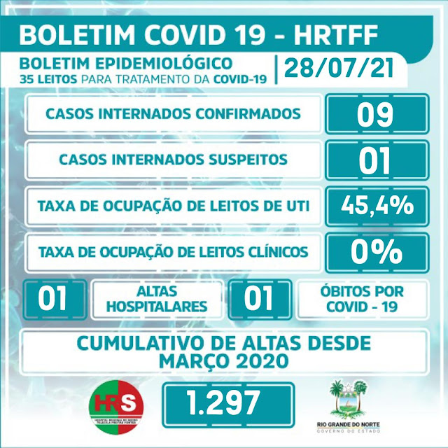 Ainda segundo o Regula RN, há um total de 246 pacientes internados no serviço público para tratamento da covid-19, sendo 141 em leitos críticos e 105 em leitos clínicos. No momento da checagem, havia três pacientes na fila de espera por leito. Os dados do Regula RN mostram também que, nesta quarta-feira, existem 201 leitos críticos disponíveis e 236 leitos clínicos disponíveis. Ou seja, os pacientes em espera aguardam apenas os trâmites para regulação.